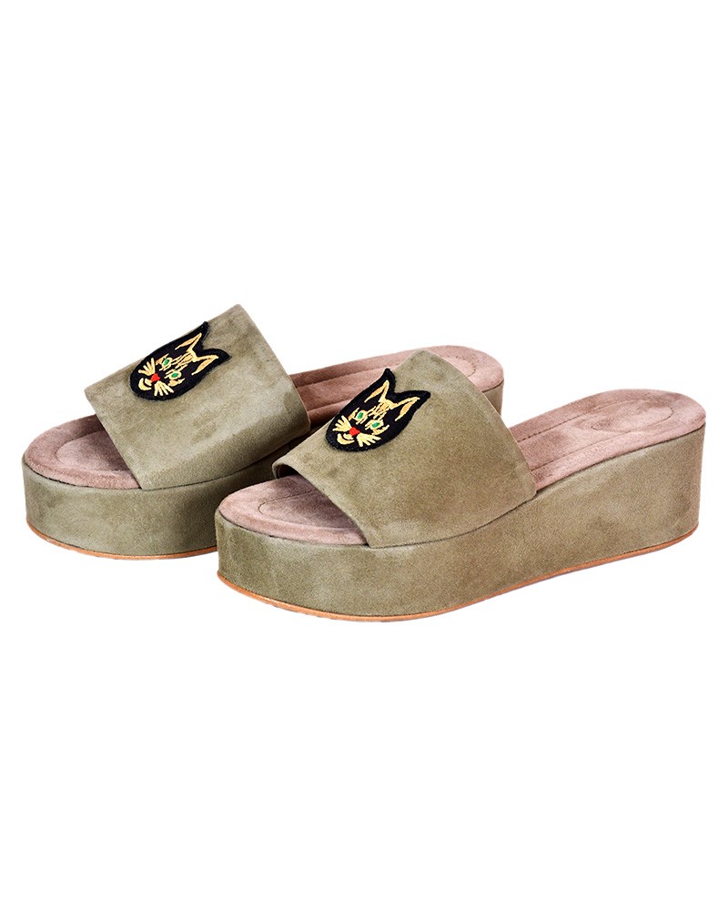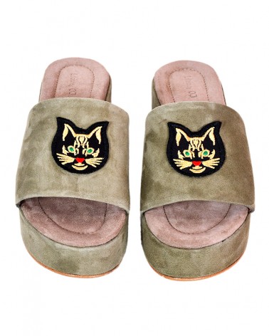 Mules dété couleur Kaki à talons compensées de la collection Chat de Lilou By OJ, on aime son confort et sa légèreté.