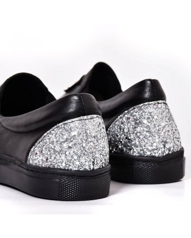 Les Slip-On en cuir noir avec les talons pailletés de Lilou By OJ représente un modèle sans lacets confortable de qualité supérieure qui allie tendance et confort.